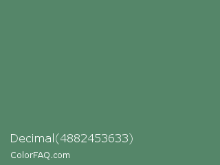 Decimal 4882453633 Color is a normal green color and the nearest color is Spring Leaves #578363. Hex code #558669 and RGB value is rgb(85,134,105). In RGB color space, this color is composed of 33% red, 53% green, 41% blue, In CMYK color space, this color is composed of 37% cyan, 0% magenta, 22% yellow , 47% black , In HSL color space, this color has a hue angle of 144° , 22% saturation and 43% lightness.