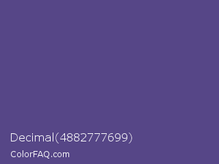 Decimal 4882777699 Color is a normal indigo color and the nearest color is Victoria #534491. Hex code #564687 and RGB value is rgb(86,70,135). In RGB color space, this color is composed of 34% red, 27% green, 53% blue, In CMYK color space, this color is composed of 36% cyan, 48% magenta, 0% yellow , 47% black , In HSL color space, this color has a hue angle of 255° , 32% saturation and 40% lightness.