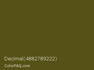 Decimal 4882789222 Color is a very dark yellow color and the nearest color is Saratoga #555b10. Hex code #565116 and RGB value is rgb(86,81,22). In RGB color space, this color is composed of 34% red, 32% green, 9% blue, In CMYK color space, this color is composed of 0% cyan, 6% magenta, 74% yellow , 66% black , In HSL color space, this color has a hue angle of 55° , 59% saturation and 21% lightness.