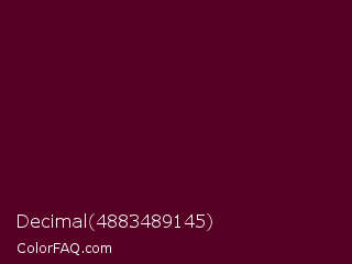 Decimal 4883489145 Color is a very dark rose color and the nearest color is Bordeaux #5c0120. Hex code #570023 and RGB value is rgb(87,0,35). In RGB color space, this color is composed of 34% red, 0% green, 14% blue, In CMYK color space, this color is composed of 0% cyan, 100% magenta, 60% yellow , 66% black , In HSL color space, this color has a hue angle of 336° , 100% saturation and 17% lightness.