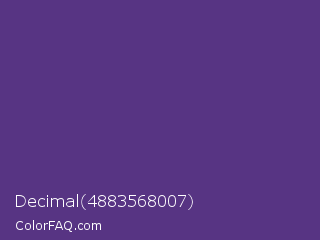 Decimal 4883568007 Color is a normal violet color and the nearest color is Regalia #522d80. Hex code #573483 and RGB value is rgb(87,52,131). In RGB color space, this color is composed of 34% red, 20% green, 51% blue, In CMYK color space, this color is composed of 34% cyan, 60% magenta, 0% yellow , 49% black , In HSL color space, this color has a hue angle of 267° , 43% saturation and 36% lightness.