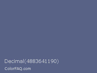 Decimal 4883641190 Color is a normal blue color and the nearest color is Paynes Grey #536878. Hex code #576286 and RGB value is rgb(87,98,134). In RGB color space, this color is composed of 34% red, 38% green, 53% blue, In CMYK color space, this color is composed of 35% cyan, 27% magenta, 0% yellow , 47% black , In HSL color space, this color has a hue angle of 226° , 21% saturation and 43% lightness.