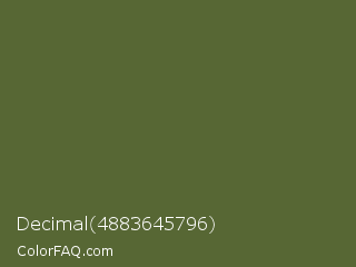 Decimal 4883645796 Color is a dark lime color and the nearest color is Dark Olive Green #556b2f. Hex code #576734 and RGB value is rgb(87,103,52). In RGB color space, this color is composed of 34% red, 40% green, 20% blue, In CMYK color space, this color is composed of 16% cyan, 0% magenta, 50% yellow , 60% black , In HSL color space, this color has a hue angle of 79° , 33% saturation and 30% lightness.