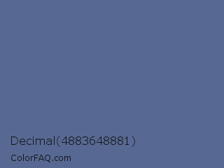 Decimal 4883648881 Color is a normal blue color and the nearest color is UCLA Blue #536895. Hex code #576993 and RGB value is rgb(87,105,147). In RGB color space, this color is composed of 34% red, 41% green, 58% blue, In CMYK color space, this color is composed of 41% cyan, 29% magenta, 0% yellow , 42% black , In HSL color space, this color has a hue angle of 222° , 26% saturation and 46% lightness.