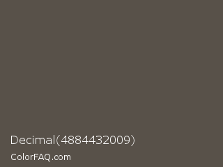 Decimal 4884432009 Color is a normal orange color and the nearest color is Fuscous Gray #54534d. Hex code #585149 and RGB value is rgb(88,81,73). In RGB color space, this color is composed of 35% red, 32% green, 29% blue, In CMYK color space, this color is composed of 0% cyan, 8% magenta, 17% yellow , 65% black , In HSL color space, this color has a hue angle of 32° , 9% saturation and 32% lightness.