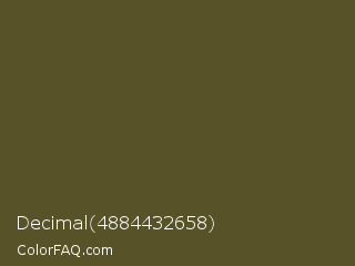 Decimal 4884432658 Color is a dark yellow color and the nearest color is Woodland #4d5328. Hex code #585228 and RGB value is rgb(88,82,40). In RGB color space, this color is composed of 35% red, 32% green, 16% blue, In CMYK color space, this color is composed of 0% cyan, 7% magenta, 55% yellow , 65% black , In HSL color space, this color has a hue angle of 53° , 38% saturation and 25% lightness.