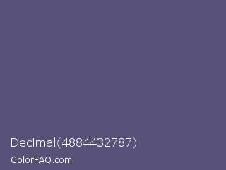 Decimal 4884432787 Color is a normal indigo color and the nearest color is Purple Navy #4e5180. Hex code #585279 and RGB value is rgb(88,82,121). In RGB color space, this color is composed of 35% red, 32% green, 47% blue, In CMYK color space, this color is composed of 27% cyan, 32% magenta, 0% yellow , 53% black , In HSL color space, this color has a hue angle of 249° , 19% saturation and 40% lightness.