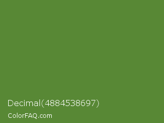 Decimal 4884538697 Color is a normal green color and the nearest color is Maximum Green #5e8c31. Hex code #588835 and RGB value is rgb(88,136,53). In RGB color space, this color is composed of 35% red, 53% green, 21% blue, In CMYK color space, this color is composed of 35% cyan, 0% magenta, 61% yellow , 47% black , In HSL color space, this color has a hue angle of 95° , 44% saturation and 37% lightness.