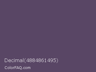 Decimal 4884861495 Color is a normal purple color and the nearest color is Mulled Wine #4e4562. Hex code #594665 and RGB value is rgb(89,70,101). In RGB color space, this color is composed of 35% red, 27% green, 40% blue, In CMYK color space, this color is composed of 12% cyan, 31% magenta, 0% yellow , 60% black , In HSL color space, this color has a hue angle of 277° , 18% saturation and 34% lightness.