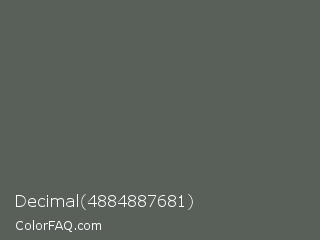Decimal 4884887681 Color is a normal green color and the nearest color is Chicago #5d5c58. Hex code #596059 and RGB value is rgb(89,96,89). In RGB color space, this color is composed of 35% red, 38% green, 35% blue, In CMYK color space, this color is composed of 7% cyan, 0% magenta, 7% yellow , 62% black , In HSL color space, this color has a hue angle of 120° , 4% saturation and 36% lightness.