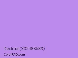 Decimal 305488689 Color is a light purple color and the nearest color is Bright Lavender #bf94e4. Hex code #bc8aeb and RGB value is rgb(188,138,235). In RGB color space, this color is composed of 74% red, 54% green, 92% blue, In CMYK color space, this color is composed of 20% cyan, 41% magenta, 0% yellow , 8% black , In HSL color space, this color has a hue angle of 271° , 71% saturation and 73% lightness.