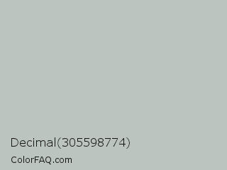 Decimal 305598774 Color is a light green color and the nearest color is Silver Sand #bfc1c2. Hex code #bcc4c0 and RGB value is rgb(188,196,192). In RGB color space, this color is composed of 74% red, 77% green, 75% blue, In CMYK color space, this color is composed of 4% cyan, 0% magenta, 2% yellow , 23% black , In HSL color space, this color has a hue angle of 150° , 6% saturation and 75% lightness.