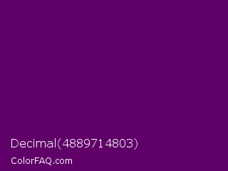 Decimal 4889714803 Color is a very dark magenta color and the nearest color is Clairvoyant #480656. Hex code #600069 and RGB value is rgb(96,0,105). In RGB color space, this color is composed of 38% red, 0% green, 41% blue, In CMYK color space, this color is composed of 9% cyan, 100% magenta, 0% yellow , 59% black , In HSL color space, this color has a hue angle of 295° , 100% saturation and 21% lightness.
