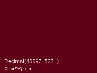 Decimal 4889715271 Color is a very dark red color and the nearest color is Bordeaux #5c0120. Hex code #600117 and RGB value is rgb(96,1,23). In RGB color space, this color is composed of 38% red, 0% green, 9% blue, In CMYK color space, this color is composed of 0% cyan, 99% magenta, 76% yellow , 62% black , In HSL color space, this color has a hue angle of 346° , 98% saturation and 19% lightness.