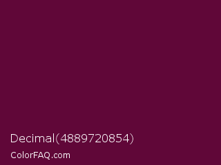 Decimal 4889720854 Color is a very dark magenta color and the nearest color is Mulberry Wood #5c0536. Hex code #600738 and RGB value is rgb(96,7,56). In RGB color space, this color is composed of 38% red, 3% green, 22% blue, In CMYK color space, this color is composed of 0% cyan, 93% magenta, 42% yellow , 62% black , In HSL color space, this color has a hue angle of 327° , 86% saturation and 20% lightness.