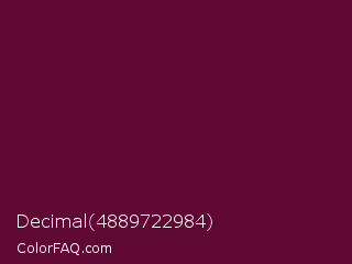 Decimal 4889722984 Color is a very dark rose color and the nearest color is Mulberry Wood #5c0536. Hex code #600834 and RGB value is rgb(96,8,52). In RGB color space, this color is composed of 38% red, 3% green, 20% blue, In CMYK color space, this color is composed of 0% cyan, 92% magenta, 46% yellow , 62% black , In HSL color space, this color has a hue angle of 330° , 85% saturation and 20% lightness.