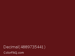 Decimal 4889735441 Color is a dark red color and the nearest color is Cherrywood #651a14. Hex code #601417 and RGB value is rgb(96,20,23). In RGB color space, this color is composed of 38% red, 8% green, 9% blue, In CMYK color space, this color is composed of 0% cyan, 79% magenta, 76% yellow , 62% black , In HSL color space, this color has a hue angle of 358° , 66% saturation and 23% lightness.