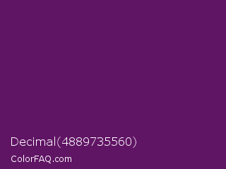 Decimal 4889735560 Color is a dark magenta color and the nearest color is Palatinate Purple #682860. Hex code #601464 and RGB value is rgb(96,20,100). In RGB color space, this color is composed of 38% red, 8% green, 39% blue, In CMYK color space, this color is composed of 4% cyan, 80% magenta, 0% yellow , 61% black , In HSL color space, this color has a hue angle of 297° , 67% saturation and 24% lightness.