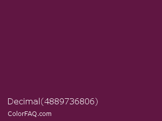 Decimal 4889736806 Color is a dark magenta color and the nearest color is Wine Berry #591d35. Hex code #601642 and RGB value is rgb(96,22,66). In RGB color space, this color is composed of 38% red, 9% green, 26% blue, In CMYK color space, this color is composed of 0% cyan, 77% magenta, 31% yellow , 62% black , In HSL color space, this color has a hue angle of 324° , 63% saturation and 23% lightness.
