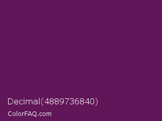 Decimal 4889736840 Color is a dark magenta color and the nearest color is Palatinate Purple #682860. Hex code #601658 and RGB value is rgb(96,22,88). In RGB color space, this color is composed of 38% red, 9% green, 35% blue, In CMYK color space, this color is composed of 0% cyan, 77% magenta, 8% yellow , 62% black , In HSL color space, this color has a hue angle of 306° , 63% saturation and 23% lightness.