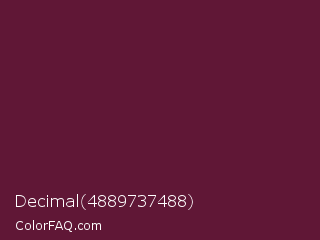Decimal 4889737488 Color is a dark rose color and the nearest color is Wine Berry #591d35. Hex code #601736 and RGB value is rgb(96,23,54). In RGB color space, this color is composed of 38% red, 9% green, 21% blue, In CMYK color space, this color is composed of 0% cyan, 76% magenta, 44% yellow , 62% black , In HSL color space, this color has a hue angle of 335° , 61% saturation and 23% lightness.