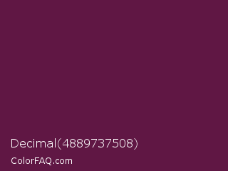 Decimal 4889737508 Color is a dark magenta color and the nearest color is Tawny Port #692545. Hex code #601744 and RGB value is rgb(96,23,68). In RGB color space, this color is composed of 38% red, 9% green, 27% blue, In CMYK color space, this color is composed of 0% cyan, 76% magenta, 29% yellow , 62% black , In HSL color space, this color has a hue angle of 323° , 61% saturation and 23% lightness.