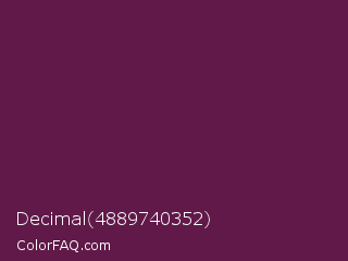 Decimal 4889740352 Color is a dark magenta color and the nearest color is Tawny Port #692545. Hex code #601948 and RGB value is rgb(96,25,72). In RGB color space, this color is composed of 38% red, 10% green, 28% blue, In CMYK color space, this color is composed of 0% cyan, 74% magenta, 25% yellow , 62% black , In HSL color space, this color has a hue angle of 320° , 59% saturation and 24% lightness.