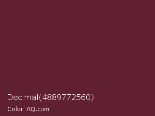 Decimal 4889772560 Color is a dark rose color and the nearest color is Wine Berry #591d35. Hex code #602032 and RGB value is rgb(96,32,50). In RGB color space, this color is composed of 38% red, 13% green, 20% blue, In CMYK color space, this color is composed of 0% cyan, 67% magenta, 48% yellow , 62% black , In HSL color space, this color has a hue angle of 343° , 50% saturation and 25% lightness.