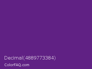 Decimal 4889773384 Color is a normal purple color and the nearest color is KSU Purple #512888. Hex code #602184 and RGB value is rgb(96,33,132). In RGB color space, this color is composed of 38% red, 13% green, 52% blue, In CMYK color space, this color is composed of 27% cyan, 75% magenta, 0% yellow , 48% black , In HSL color space, this color has a hue angle of 278° , 60% saturation and 32% lightness.