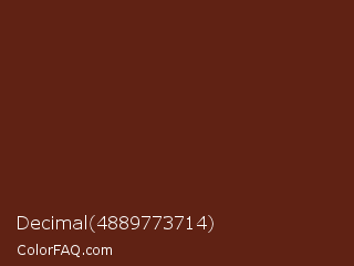 Decimal 4889773714 Color is a dark red color and the nearest color is Espresso #612718. Hex code #602214 and RGB value is rgb(96,34,20). In RGB color space, this color is composed of 38% red, 13% green, 8% blue, In CMYK color space, this color is composed of 0% cyan, 65% magenta, 79% yellow , 62% black , In HSL color space, this color has a hue angle of 11° , 66% saturation and 23% lightness.