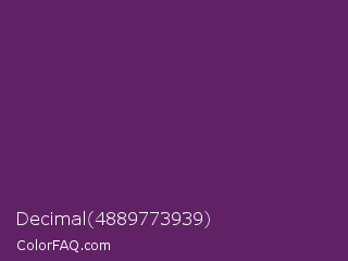 Decimal 4889773939 Color is a dark magenta color and the nearest color is Palatinate Purple #682860. Hex code #602265 and RGB value is rgb(96,34,101). In RGB color space, this color is composed of 38% red, 13% green, 40% blue, In CMYK color space, this color is composed of 5% cyan, 66% magenta, 0% yellow , 60% black , In HSL color space, this color has a hue angle of 296° , 50% saturation and 26% lightness.