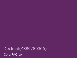 Decimal 4889780306 Color is a dark magenta color and the nearest color is Palatinate Purple #682860. Hex code #602764 and RGB value is rgb(96,39,100). In RGB color space, this color is composed of 38% red, 15% green, 39% blue, In CMYK color space, this color is composed of 4% cyan, 61% magenta, 0% yellow , 61% black , In HSL color space, this color has a hue angle of 296° , 44% saturation and 27% lightness.