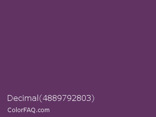 Decimal 4889792803 Color is a dark magenta color and the nearest color is Imperial #602f6b. Hex code #603363 and RGB value is rgb(96,51,99). In RGB color space, this color is composed of 38% red, 20% green, 39% blue, In CMYK color space, this color is composed of 3% cyan, 48% magenta, 0% yellow , 61% black , In HSL color space, this color has a hue angle of 296° , 32% saturation and 29% lightness.