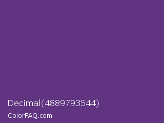 Decimal 4889793544 Color is a normal purple color and the nearest color is Eminence #6c3082. Hex code #603480 and RGB value is rgb(96,52,128). In RGB color space, this color is composed of 38% red, 20% green, 50% blue, In CMYK color space, this color is composed of 25% cyan, 59% magenta, 0% yellow , 50% black , In HSL color space, this color has a hue angle of 275° , 42% saturation and 35% lightness.
