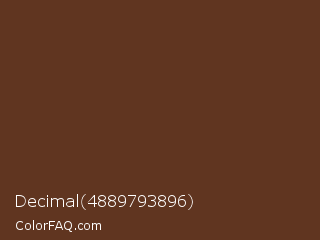 Decimal 4889793896 Color is a dark orange color and the nearest color is Irish Coffee #5f3d26. Hex code #603520 and RGB value is rgb(96,53,32). In RGB color space, this color is composed of 38% red, 21% green, 13% blue, In CMYK color space, this color is composed of 0% cyan, 45% magenta, 67% yellow , 62% black , In HSL color space, this color has a hue angle of 20° , 50% saturation and 25% lightness.