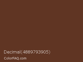 Decimal 4889793905 Color is a dark orange color and the nearest color is Irish Coffee #5f3d26. Hex code #603523 and RGB value is rgb(96,53,35). In RGB color space, this color is composed of 38% red, 21% green, 14% blue, In CMYK color space, this color is composed of 0% cyan, 45% magenta, 64% yellow , 62% black , In HSL color space, this color has a hue angle of 18° , 47% saturation and 26% lightness.