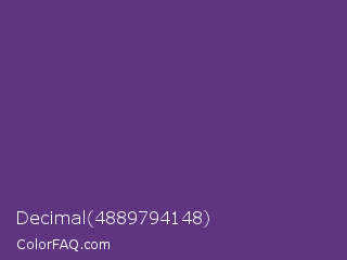 Decimal 4889794148 Color is a normal purple color and the nearest color is Eminence #6c3082. Hex code #603580 and RGB value is rgb(96,53,128). In RGB color space, this color is composed of 38% red, 21% green, 50% blue, In CMYK color space, this color is composed of 25% cyan, 59% magenta, 0% yellow , 50% black , In HSL color space, this color has a hue angle of 274° , 41% saturation and 35% lightness.