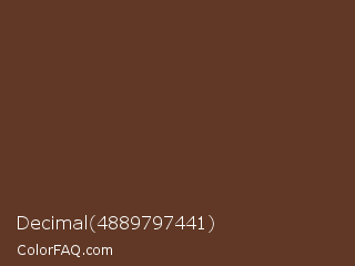 Decimal 4889797441 Color is a dark orange color and the nearest color is Irish Coffee #5f3d26. Hex code #603825 and RGB value is rgb(96,56,37). In RGB color space, this color is composed of 38% red, 22% green, 15% blue, In CMYK color space, this color is composed of 0% cyan, 42% magenta, 61% yellow , 62% black , In HSL color space, this color has a hue angle of 19° , 44% saturation and 26% lightness.