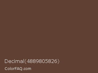 Decimal 4889805826 Color is a dark orange color and the nearest color is Quincy #623f2d. Hex code #604032 and RGB value is rgb(96,64,50). In RGB color space, this color is composed of 38% red, 25% green, 20% blue, In CMYK color space, this color is composed of 0% cyan, 33% magenta, 48% yellow , 62% black , In HSL color space, this color has a hue angle of 18° , 32% saturation and 29% lightness.