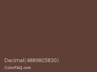 Decimal 4889805830 Color is a dark red color and the nearest color is Millbrook #594433. Hex code #604036 and RGB value is rgb(96,64,54). In RGB color space, this color is composed of 38% red, 25% green, 21% blue, In CMYK color space, this color is composed of 0% cyan, 33% magenta, 44% yellow , 62% black , In HSL color space, this color has a hue angle of 14° , 28% saturation and 29% lightness.