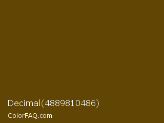 Decimal 4889810486 Color is a very dark orange color and the nearest color is Horses Neck #604913. Hex code #604504 and RGB value is rgb(96,69,4). In RGB color space, this color is composed of 38% red, 27% green, 2% blue, In CMYK color space, this color is composed of 0% cyan, 28% magenta, 96% yellow , 62% black , In HSL color space, this color has a hue angle of 42° , 92% saturation and 20% lightness.