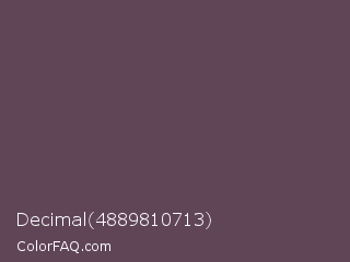 Decimal 4889810713 Color is a normal magenta color and the nearest color is Eggplant #614051. Hex code #604557 and RGB value is rgb(96,69,87). In RGB color space, this color is composed of 38% red, 27% green, 34% blue, In CMYK color space, this color is composed of 0% cyan, 28% magenta, 9% yellow , 62% black , In HSL color space, this color has a hue angle of 320° , 16% saturation and 32% lightness.