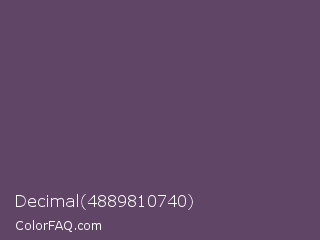 Decimal 4889810740 Color is a normal purple color and the nearest color is English Violet #563c5c. Hex code #604566 and RGB value is rgb(96,69,102). In RGB color space, this color is composed of 38% red, 27% green, 40% blue, In CMYK color space, this color is composed of 6% cyan, 32% magenta, 0% yellow , 60% black , In HSL color space, this color has a hue angle of 289° , 19% saturation and 34% lightness.