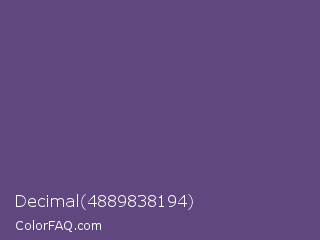 Decimal 4889838194 Color is a normal violet color and the nearest color is Cyber Grape #58427c. Hex code #604780 and RGB value is rgb(96,71,128). In RGB color space, this color is composed of 38% red, 28% green, 50% blue, In CMYK color space, this color is composed of 25% cyan, 45% magenta, 0% yellow , 50% black , In HSL color space, this color has a hue angle of 266° , 29% saturation and 39% lightness.
