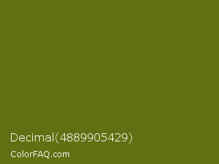 Decimal 4889905429 Color is a dark lime color and the nearest color is Fern Frond #657220. Hex code #607113 and RGB value is rgb(96,113,19). In RGB color space, this color is composed of 38% red, 44% green, 7% blue, In CMYK color space, this color is composed of 15% cyan, 0% magenta, 83% yellow , 56% black , In HSL color space, this color has a hue angle of 71° , 71% saturation and 26% lightness.