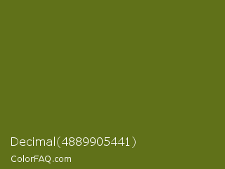 Decimal 4889905441 Color is a dark lime color and the nearest color is Fern Frond #657220. Hex code #607119 and RGB value is rgb(96,113,25). In RGB color space, this color is composed of 38% red, 44% green, 10% blue, In CMYK color space, this color is composed of 15% cyan, 0% magenta, 78% yellow , 56% black , In HSL color space, this color has a hue angle of 72° , 64% saturation and 27% lightness.