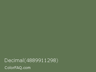 Decimal 4889911298 Color is a normal green color and the nearest color is Cactus #587156. Hex code #607552 and RGB value is rgb(96,117,82). In RGB color space, this color is composed of 38% red, 46% green, 32% blue, In CMYK color space, this color is composed of 18% cyan, 0% magenta, 30% yellow , 54% black , In HSL color space, this color has a hue angle of 96° , 18% saturation and 39% lightness.