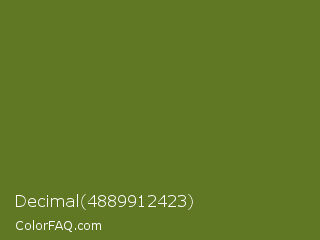 Decimal 4889912423 Color is a dark lime color and the nearest color is Fern Frond #657220. Hex code #607723 and RGB value is rgb(96,119,35). In RGB color space, this color is composed of 38% red, 47% green, 14% blue, In CMYK color space, this color is composed of 19% cyan, 0% magenta, 71% yellow , 53% black , In HSL color space, this color has a hue angle of 76° , 55% saturation and 30% lightness.