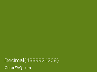 Decimal 4889924208 Color is a dark lime color and the nearest color is Vida Loca #549019. Hex code #608216 and RGB value is rgb(96,130,22). In RGB color space, this color is composed of 38% red, 51% green, 9% blue, In CMYK color space, this color is composed of 26% cyan, 0% magenta, 83% yellow , 49% black , In HSL color space, this color has a hue angle of 79° , 71% saturation and 30% lightness.