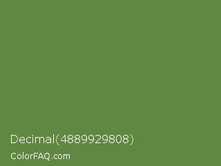 Decimal 4889929808 Color is a normal green color and the nearest color is Hippie Green #53824b. Hex code #608842 and RGB value is rgb(96,136,66). In RGB color space, this color is composed of 38% red, 53% green, 26% blue, In CMYK color space, this color is composed of 29% cyan, 0% magenta, 51% yellow , 47% black , In HSL color space, this color has a hue angle of 94° , 35% saturation and 40% lightness.